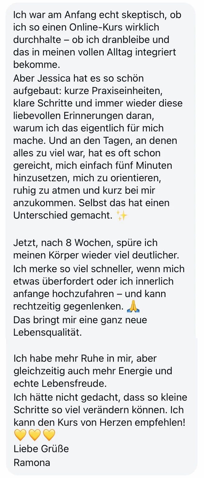 Mit liebevoller Begleitung und alltagstauglichen Körperimpulsen kommst du raus aus dem Stress und zurück in innere Ruhe und Verbindung.