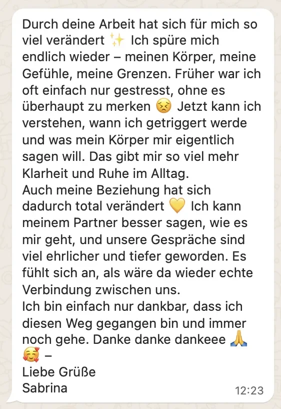 Du gehst liebevoller mit dir um und das verändert auch, wie andere dich erleben: mehr Nähe, weniger Überforderung.